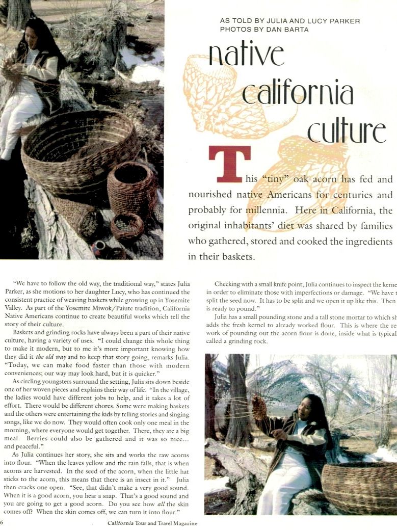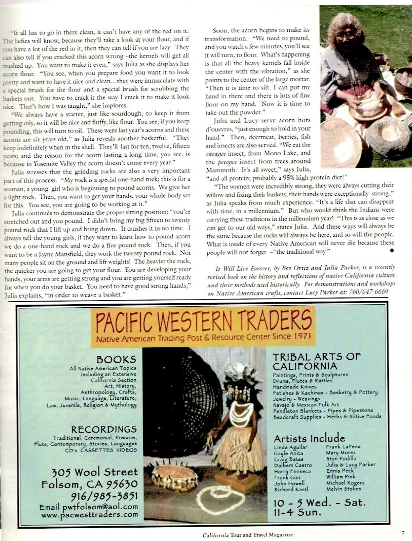 From the Fall 1999 edition Interview of Julia Parker by Robert A Bellezza, at the Bridgeport Pow Wow, and subsequent meetings with Lucy Parker, daughter and basketweaver, at the Mono Lake Inn hosted by Sarah Adams.
